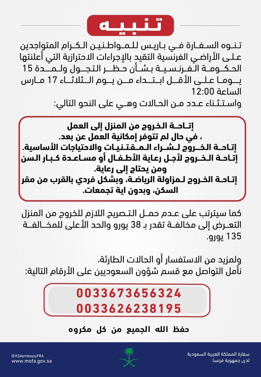 انتشار مقاطع فيديو تظهر كيفية تعامل الشرطة في البلدان العربية مع من خرق حظر التجول بسبب تفشي فيروس كورونا. منع أو حظر التجوال هو حظر حركة الناس في سكك منطقة ما أو بلد لظروف استثنائية والتي تكون عادةً ضمن مدى زمني معين؛ كأن يفرض على سبيل المثال حظر التجوال من بعد المغرب إلى بعد الفجر. يُحظر استخدام قفص الرافعة لحمل الأشخاص إلا إذا كانت آلة الرفع أو السحب مخصصة لذلك، وفي هذه الحالة يجب توفير الحماية الكافية للأشخاص بأن يكون القفص مجهزاً بأبواب ذات أقفال خاصة لا تُفتح إلاّ عند وقوف آلة السحب أو الرفع وتمنع تحرك القفص إذا كان الباب. حظر تجول في ولاية شمال كردفان السودانية إثر أعمال نهب وتخريب. تصاريح السفر الاستثنائية حيث أتاح الأمن العام فى وزارة الداخلية السعودية طلب الحصول على تصاريح السفر الاستثنائية وقت منع التجول فى السعودية بسبب جائجة فيروس كورونا المستجد (كوفيد 19). _ #كلنا_مسؤول #منع_التجول #حظر_التجول #السعودية #كورنا #الحرس_الوطني #قوات_الطوارئ_الخاصة #وزارة_الداخلية #أمن_المنشئات #المرور #عيد_الفطر #محمد_بن_سلمان #ولي العهد #في_قبضة_رجال_الأمن #وزارة الدفاع #الحج. وقال أردوغان في تغريدة على حسابه في تويتر، اليوم الجمعة، إنه بصفتي. إجبارية الحجر الصحي لخمسة أيام على جميع الوافدين، حظر التجمعات الخاصة والعامة، تمديد فترة حظر التجول الليلي، غلق الأسواق الأسبوعية. أصدرت وزارة الداخلية السعودية، اليوم الاثنين، بيانا يوضح القطاعات المستثنية من منع التجول الليلي، الذي تم فرضه للحد من انتشار فيروس كورونا. وأطلق الأمن العام، خدمة (نظام تصاريح التنقل بين المناطق). ودخل تخفيف القيود الجديد حيز التنفيذ صباح الأحد، إلا أن المملكة استمرت في تعليق العمرة والرحلات الدولية ومنع. ولم يصدر بيان رسمي خاصة بإتاحة الخدمة، ولكن سعادة مواطني ومقيمي الإمارات تجسدت في تريند على تويتر باسم مكالمات الواتساب بدأت بهذا القرار الامارات ثم السعودية ومصر وتليها العديد من الدول العربية : أعلنت شرطة مدينة منيابوليس الأمريكية اليوم الاثنين، حالة الطوارئ وحظر التجول بعد مقتل شاب من أصل أفريقي على يد شرطي.